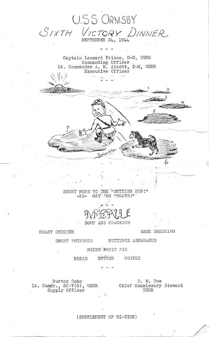 This menu is for the Victory Dinner following the September 20 landings at Peleliu. This menu was contributed by Randy Cook whose father, Jack Cook served aboard the Ormsby.